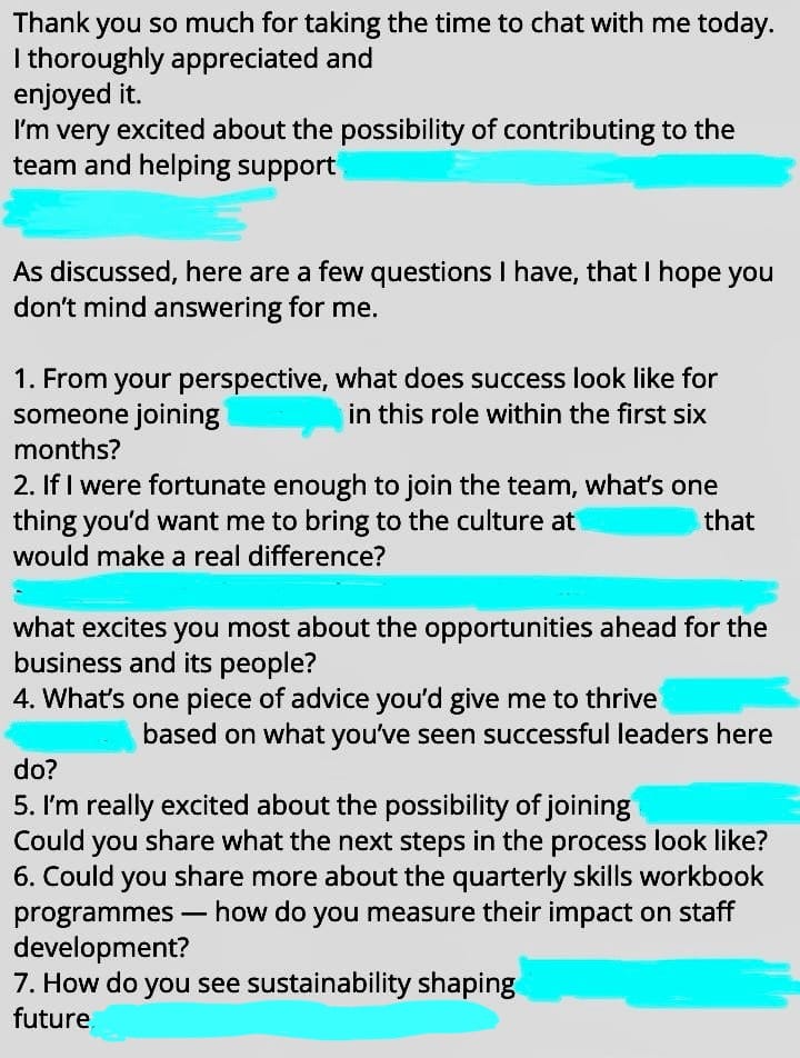 Below is an example of how not to follow up, from a post that I found on LinkedIn. Being interested is great, but avoid creating work for the interviewer and asking for a cheat code in a form of an essay.